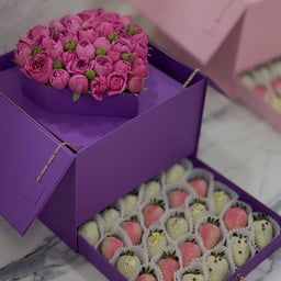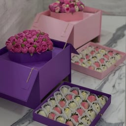 Box with peony-shaped roses and chocolate-covered strawberries - Bloomie - Dessert | Latona Sweet Treats