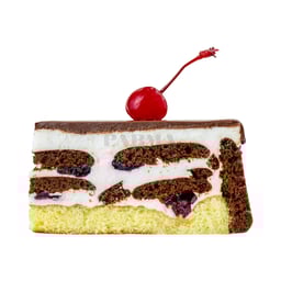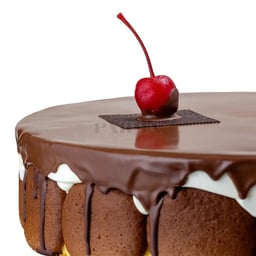 Dough: vanilla biscuit Cream: English Filling: cherry confit Coating: chocolate glaze Decoration: coffee cookies, cherry