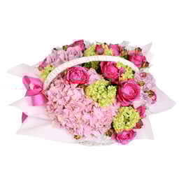 Basket with hydrangeas and peony roses – Fast Flower Delivery | Latona