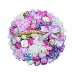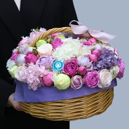 Շքեղ ծաղկե զամբյուղ՝ նուրբ վարդագույն երանգներով